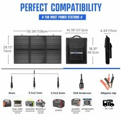 This solar panel can charge AGM, lead-acid, Gel, Calcium & LiFePO4 batteries and portable devices via a USB port, and comes with 2 adaptor cables for 30A Anderson, aviation plug, or DC connectors of various power stations.