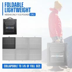With a robust carrying handle, this foldable solar panel is only 5.9kg and can be packed down to 1/8 of its full size and comes with 8 stitched loops as an added bonus for use if you make up some hooks when it gets windy.