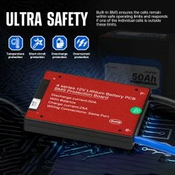 It allows 50A continuous discharge and provides voltage/ temperature monitoring and smart balancing to add rigid strength to each cell.