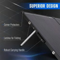 With MPPT controller to harvest 20% more energy than PWM controller, this solar panel features kickstands for more solar power harvesting and an auto-optimization function for immediate reconnection after interruption.