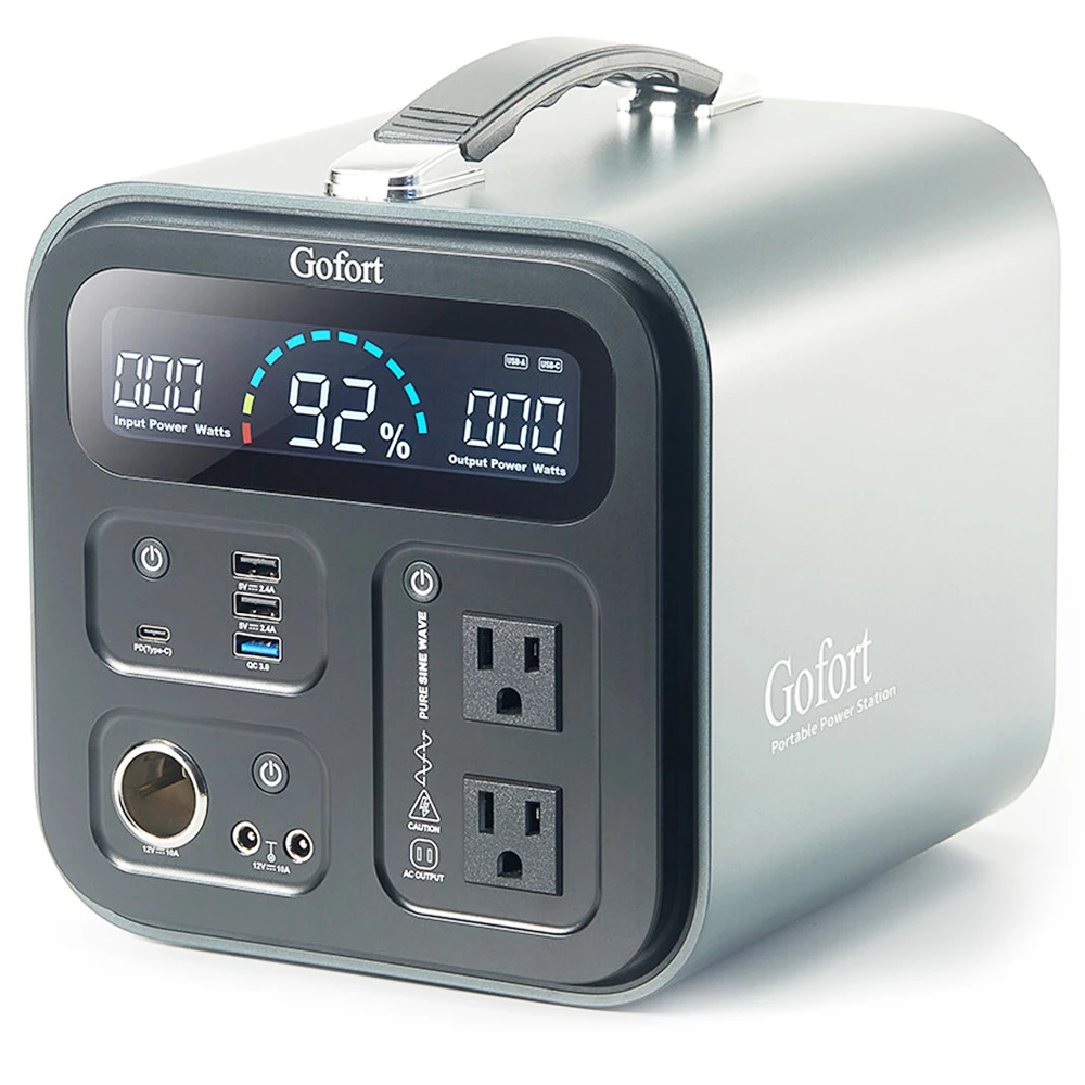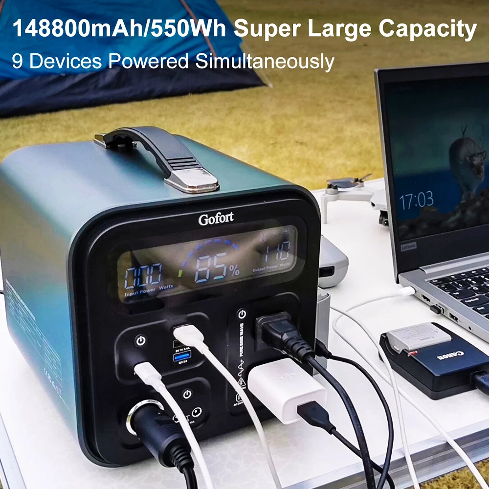 Gofort UA550 is equipped with 2x 600W Pure Sine Wave AC outlets which boast a 600W rated power and a 1000W surge to power for phones, laptops, cameras, lights, etc during hurricane or other power outage for outdoors, camping, RV, etc.