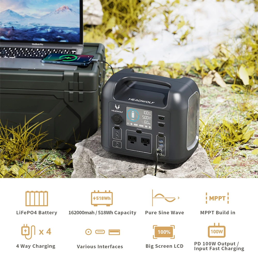 Headwolf D500 power station adopts V0 class fireproof material to ensure your safety, designed with a comfortable and stable handle, compact and unbreakable design making it to get great portability, also comes with a 4 mode LED light, will be a great choice for you to use in outdoor camping in dark night.