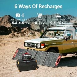 It can be charged from a car port for about 7-8 hours while on the road/off-road, from a wall charger for about 7-8 hours, and from a USB-C PD charger for about 9.5 hours. And the solar panel (sold separately) can charge the power station through the DC port (72W) or Anderson port (120W max). For the fastest charging method, you can use a USB-C PD charger (45W) and a wall charger together or with a solar panel charger (72W), which only needs about 3H with 117W charging power.