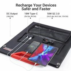 The solar charger is smart, which can detect the needs of your device and deliver exactly what it needs, and maximize its charging speed while protecting your devices from overcharging and overloading. It is equipped with QC 3.0 USB port and USB-C port, providing four times faster than ordinary solar panel speed for your smartphones, tablets, DV, etc.