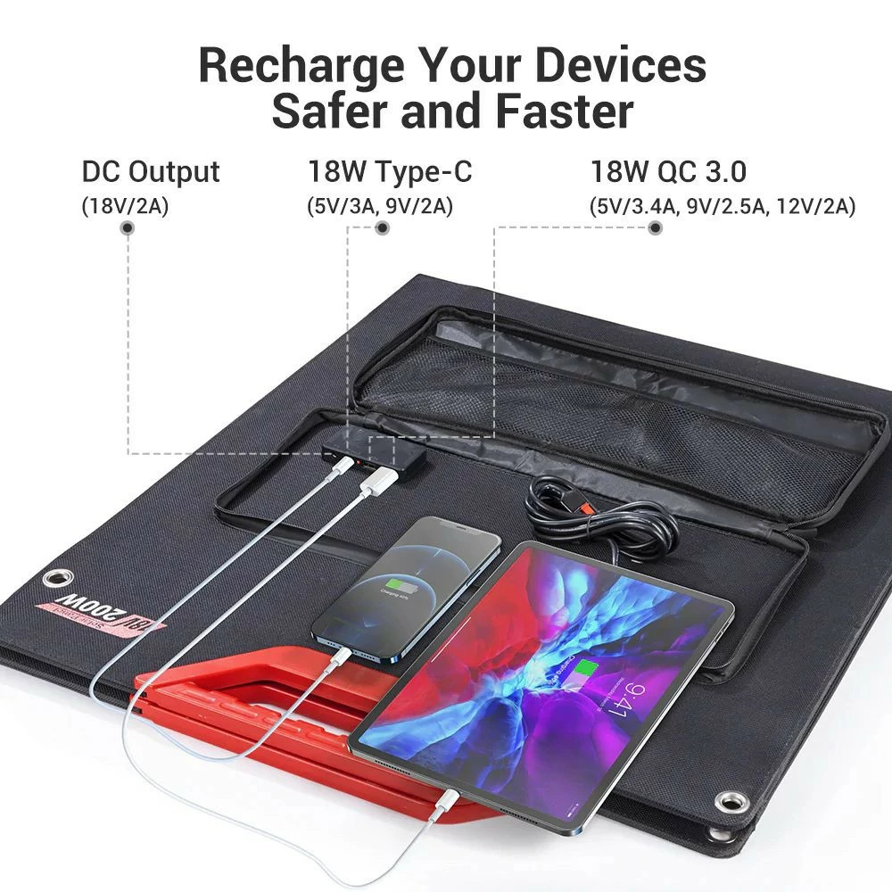 | Specification | Peak Power: 200W Cell Efficiency: 23.50% Power Voltage: 18V Power Current: 11.1A max Short Circuit Current: 12.6A QC 3.0: 18W Max Type-C: 18W Max Parallel Capable: Yes 4-in-1 Cable: 5.5*2.1mm, Anderson(Up & Down), XT60, 7.9*0.9mm Operating Temperature Range: -20 – 65 Celsius |